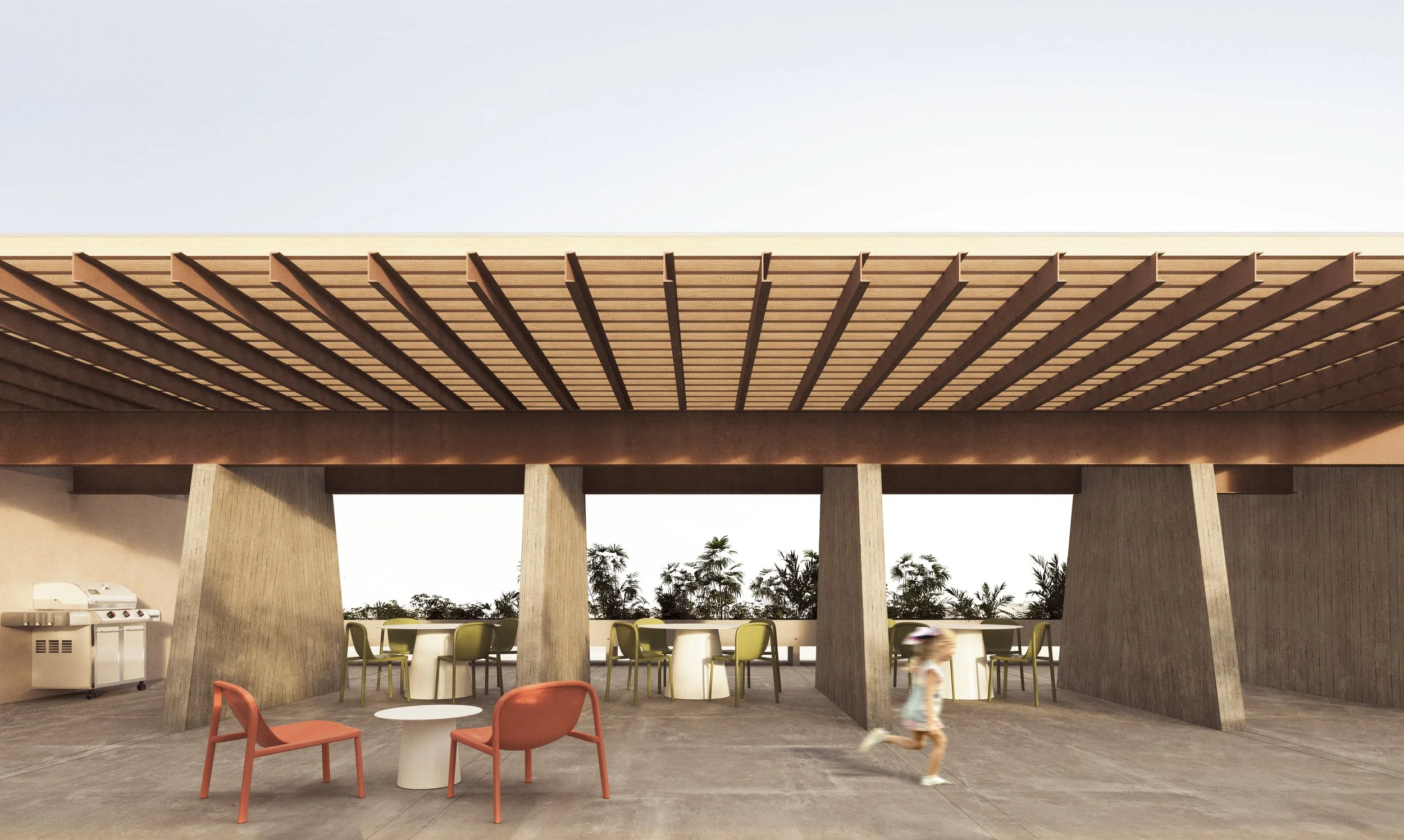 Torre de departamentos donde la combinación de cemento, madera y tabique crea un equilibrio entre solidez y calidez. Los detalles en madera aportan una sensación acogedora, generando un entorno armonioso que resalta la materialidad y el carácter del diseño.